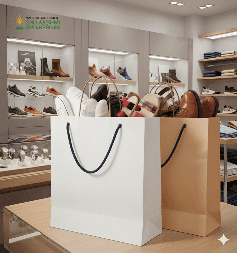 Customized Brown 100 GSM Footwear Paper Bag with Handle is a sturdy, eco-friendly packaging solution designed for branded footwear packaging and retail use.